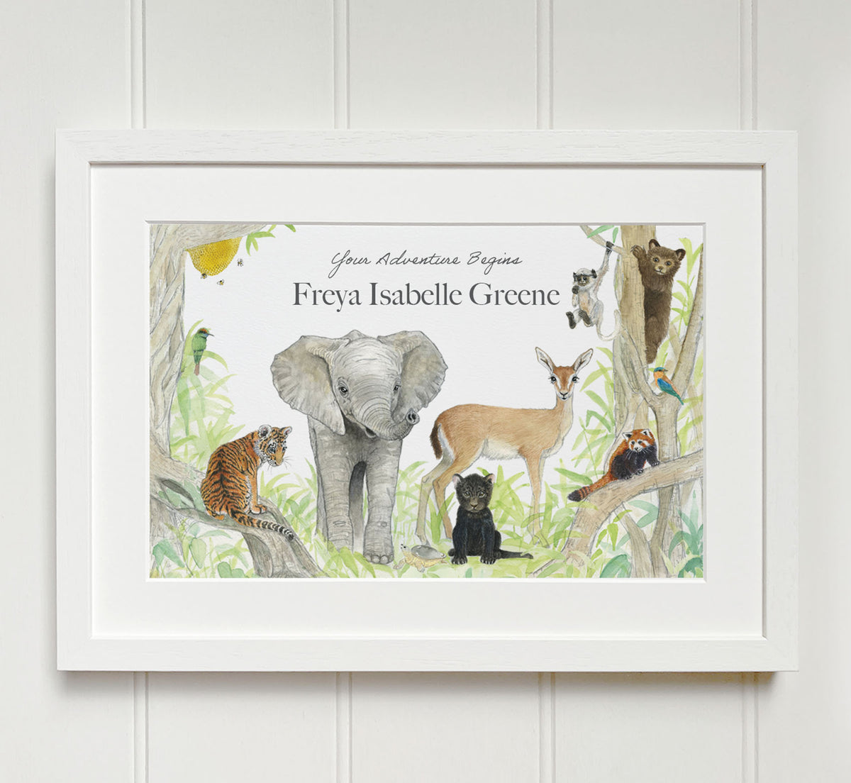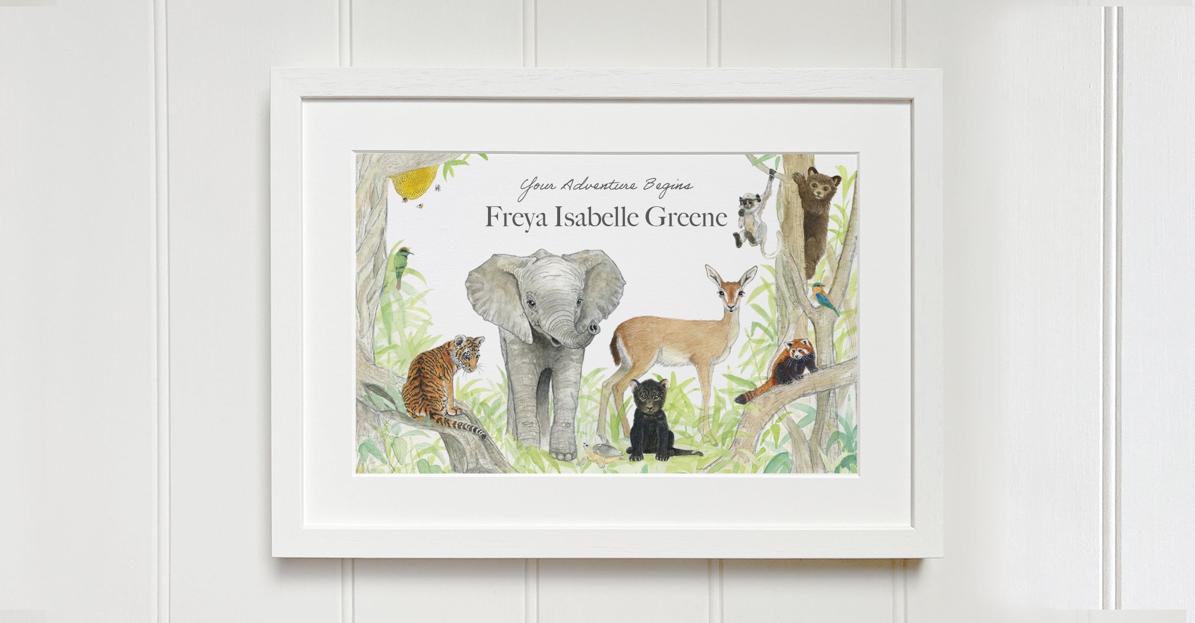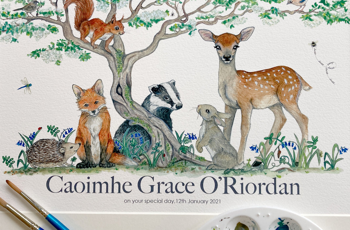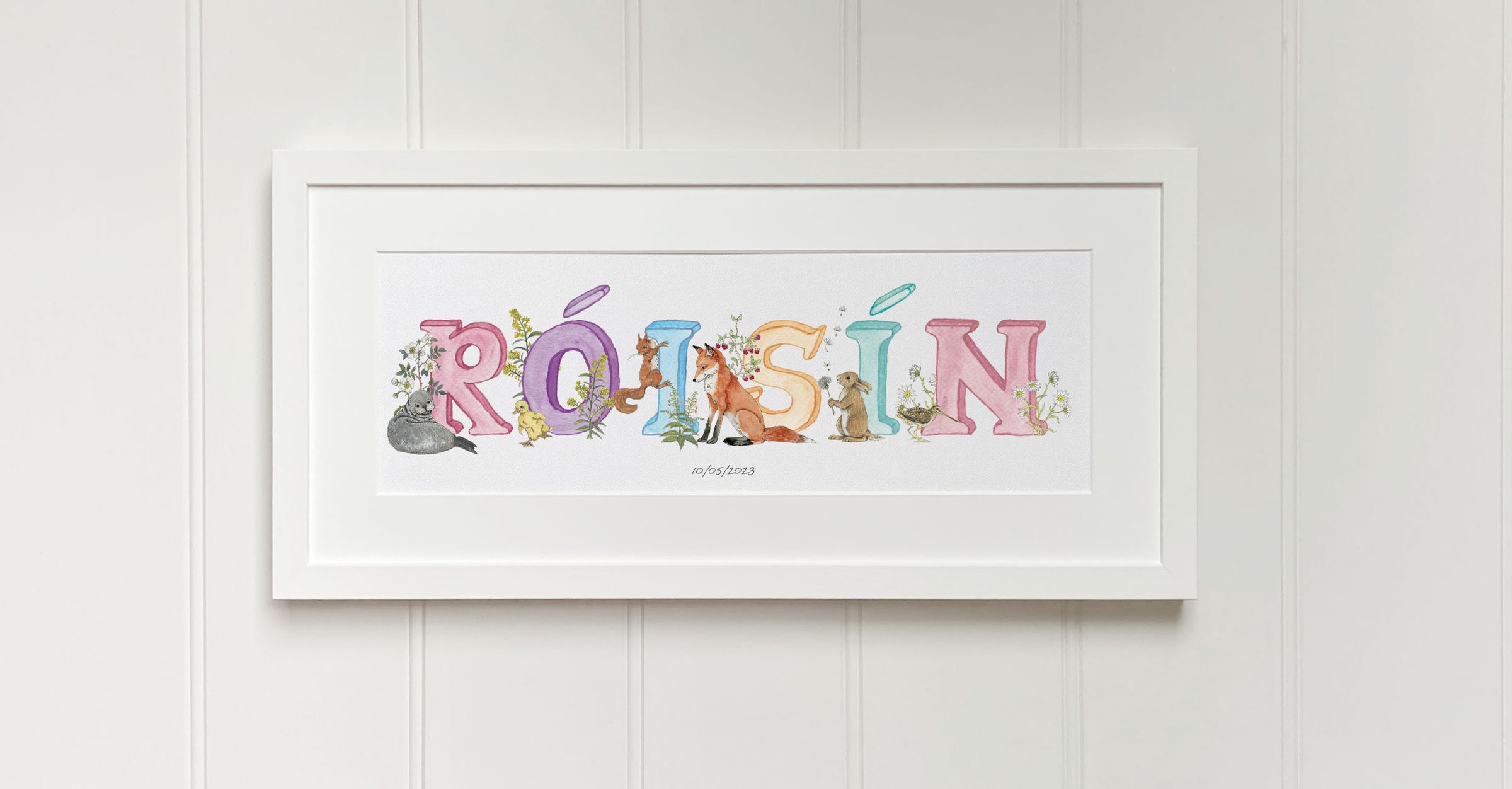 Personalised baby gifts to celebrate the birth of a newborn, a cherished special occasion, or as unique children's room art. Inspired by Irish nature and childhood tales, Fiadh and Finn create fine art giclée framed prints and baby name frames, from original watercolour artwork created and framed in County Kildare, Ireland.